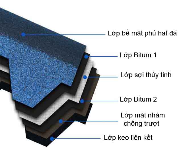 Tấm lợp bitum phủ đá có kết cấu nhẹ với thành phần gồm hạt nhựa bitum, sợi thủy tinh gia cường và trên bề mặt được phủ lớp đá tự nhiên xay nhuyễn: