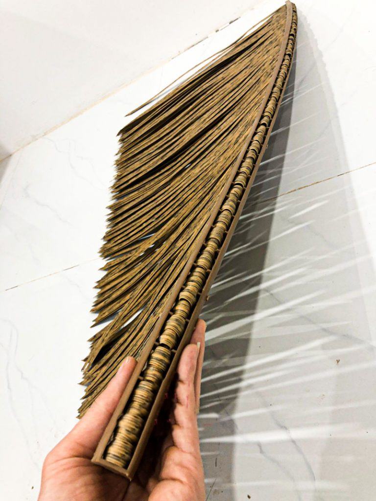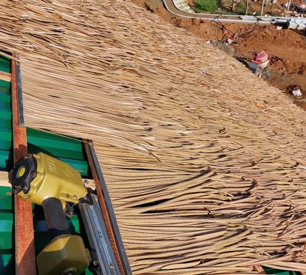 - Bước 2: Sử dụng dây đồng buộc 3 điểm trên tấm. Buộc cố định tấm rơm với lưới thép. Buộc từ chân mái lên đến đỉnh mái. Hàng rơm đầu tiên và thứ 2 cách mép mái lần lượt là 5 – 10cm. Các hàng rơm nhân tạo tiếp theo cách đều nhau từ 30-25cm (tương ứng với mật độ lợp rơm nhân tạo là 6 – 8 tấm/m2). Phần đỉnh mái: Bẻ đôi tấm rơm úp lên nóc mái theo khoảng cách 15cm