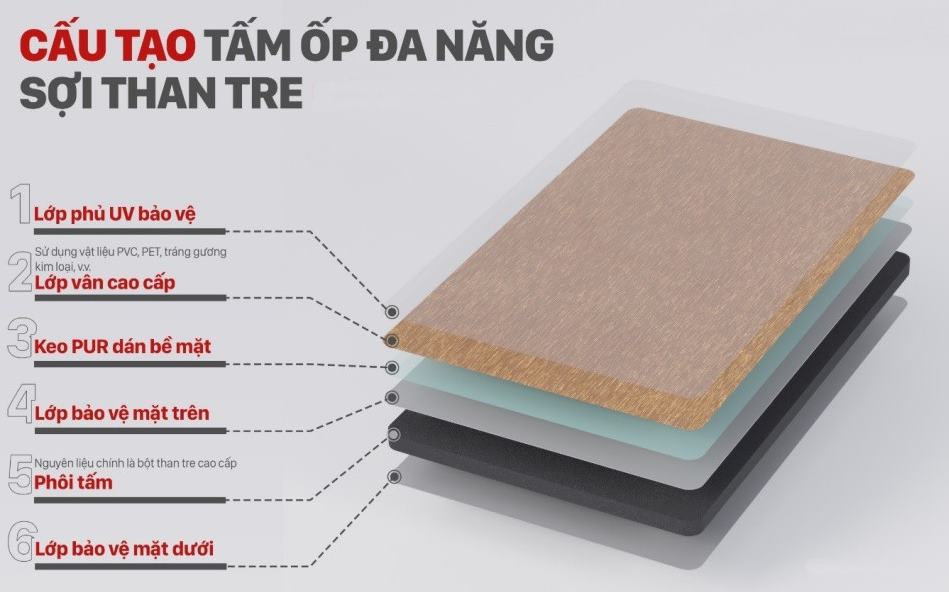 Mỗi lớp trong cấu tạo tấm ốp than tre đều có chức năng đặc biệt, đóng góp vào việc tạo nên một sản phẩm vừa đẹp vừa bền, đáp ứng được cả yếu tố kỹ thuật lẫn thẩm mỹ trong thiết kế nội thất.