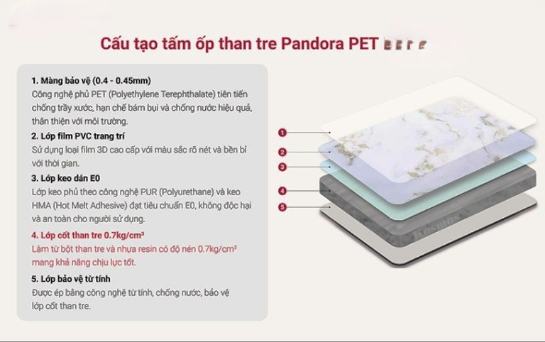 - Lớp Mặt - Lớp bảo về mặt trên: Tấm ốp Pandora TT-830 đá mây ánh vàng phủ PET được sản xuất từ cốt than tre, tạo nên độ bền vượt trội và khả năng chống ẩm tốt. Lớp mặt của tấm ốp than tre thường được hoàn thiện với một loạt các vân và màu sắc khác nhau. Có thể là vân gỗ tự nhiên, vân đá hoặc thậm chí là các mẫu thiết kế hiện đại, tùy theo yêu cầu về thẩm mỹ của khách hàng.
