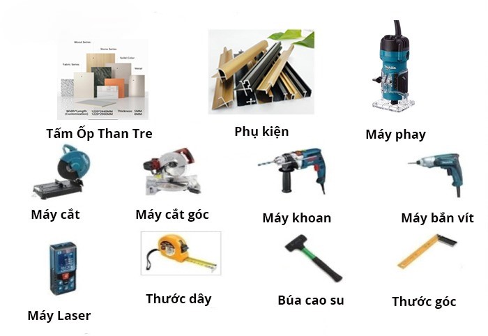 + Bước 1: Chuẩn bị vật tư, dụng cụ thi công tấm ốp than tre