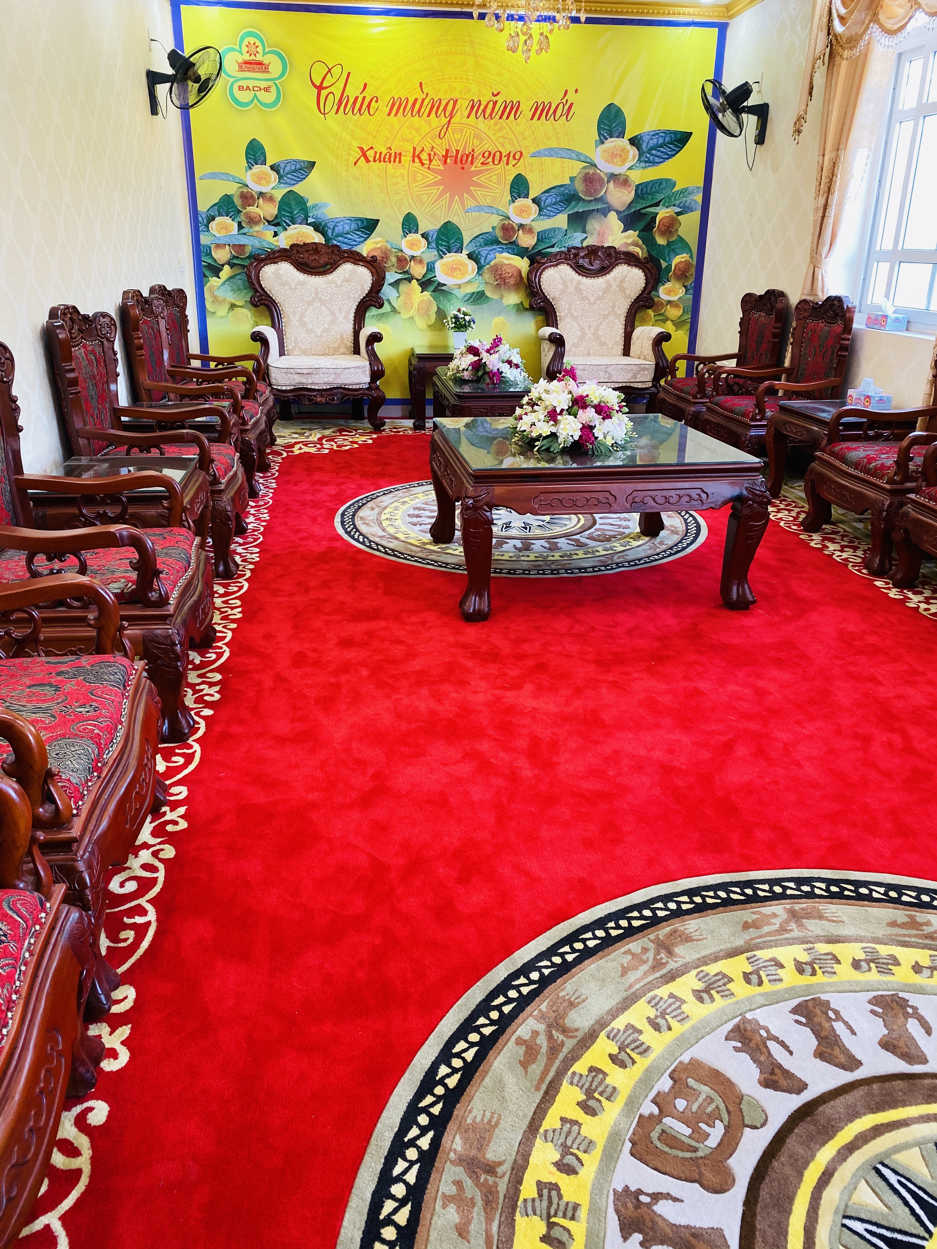Thảm khánh tiết được dệt thủ công từ sợi acrylic là dòng sợi len cao cấp, sợi acrylic là sợi tổng hợp được làm từ polymer được tạo ra bằng cách trùng hợp acrylonitril hoặc đồng trùng hợp với các monome khác. Nó có một kết cấu mềm mại và ấm áp, khả năng nhuộm, hút ẩm và chống mốc cực kỳ tốt. Bởi vậy nó có các ưu điểm vượt trội hơn so với các chất liệu sợi khác nên thảm khánh tiết dệt tay acrylic là một lựa chọn hợp lý cho phòng khánh tiết cần sự sang trọng.