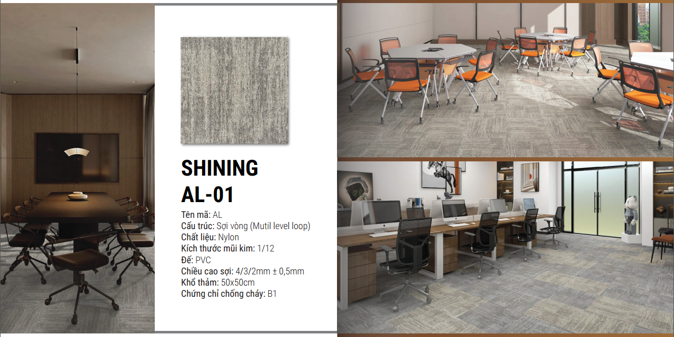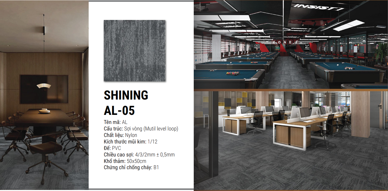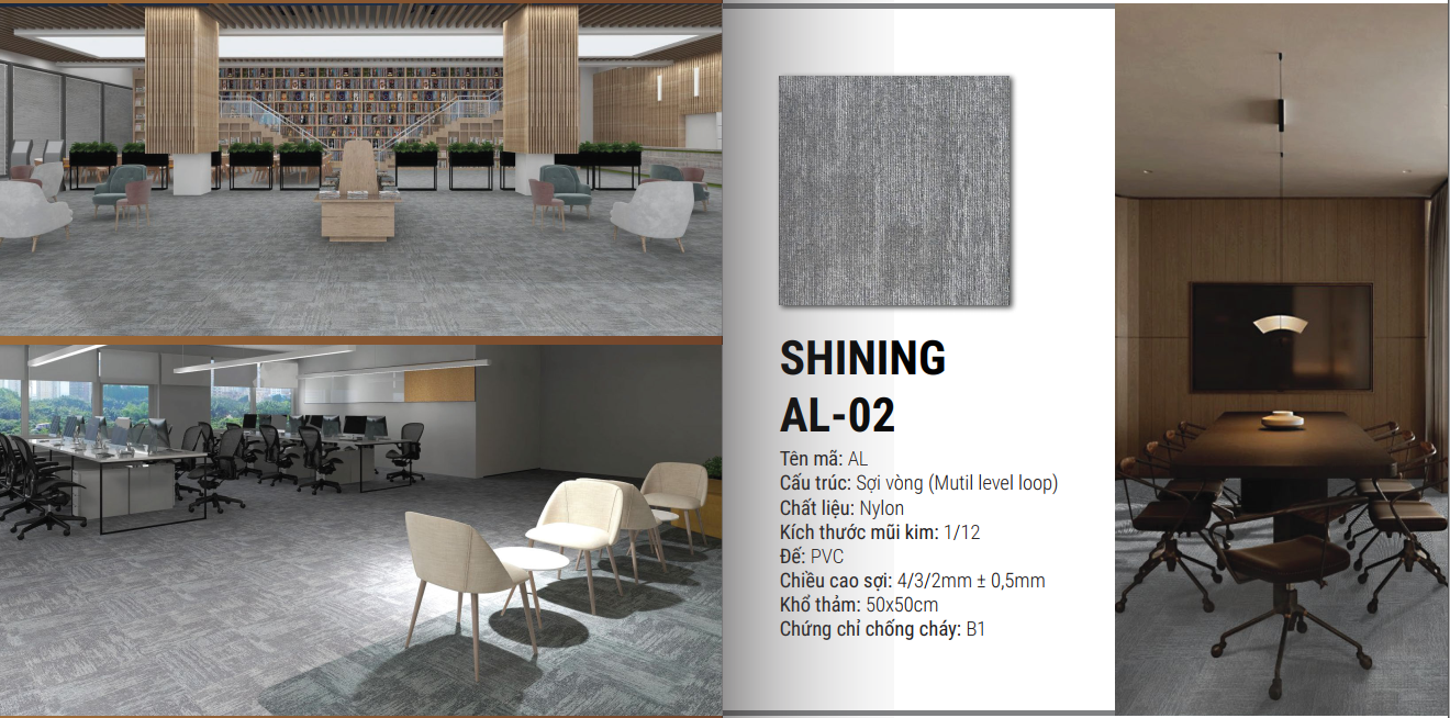 Thảm tấm nylon cao cấp GOMA-SHINING-AL là dòng thảm gạch hay còn gọi là thảm tấm, thảm có kích thước 50cm x 50cm rất được ưa chuộng hiện nay vì có nhiều ưu điểm nỗi bật so với các dòng thảm khác. Những ưu điểm đáng chú ý nhất của dòng thảm trải sàn này là rất đẹp, độ bền cao, dễ dàng lắp ghép và thay thế, dễ phối màu và cực kỳ sang trọng. Bởi vậy, dòng vật liệu Thảm tấm nylon cao cấp GOMA-SHINING-AL này rất được khách hàng ưa chuộng và là một trong những dòng thảm trải sàn bán chạy nhất.